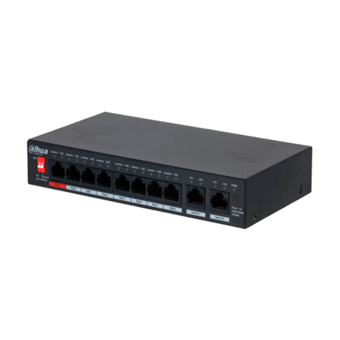 8 Puertos Poe, 2 Puertos Uplink; Distancia Poe 250M; Admite Perro Guardian Poe; El Puerto Rojo Es Compatible Con Los Estandares Ieee802.3Bt Y Hi-Poe, Consumo Max. 90W.